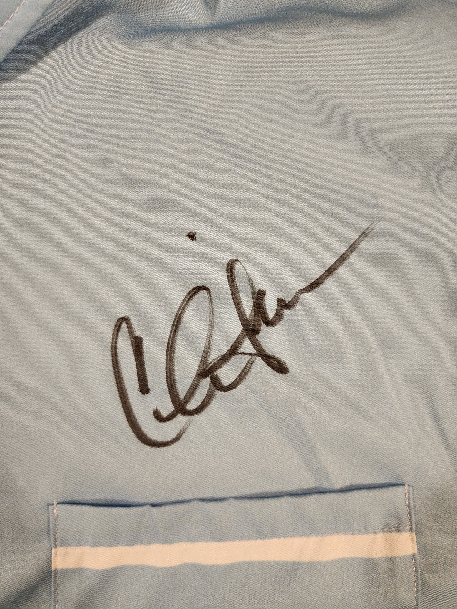You are buying a Charlie Sheen Autographed Signed Two and A Half Men Blue Bowling Shirt with Beckett BAS authentication. This bowling shirt similar to what he wore on 2 and 1/2 Men features Sheen’s signature, signed in crisp black marker during our exclusive signing event in Atlantic City NJ on November 7th, 2025 alongside our long time graphing partners LGC Sports.