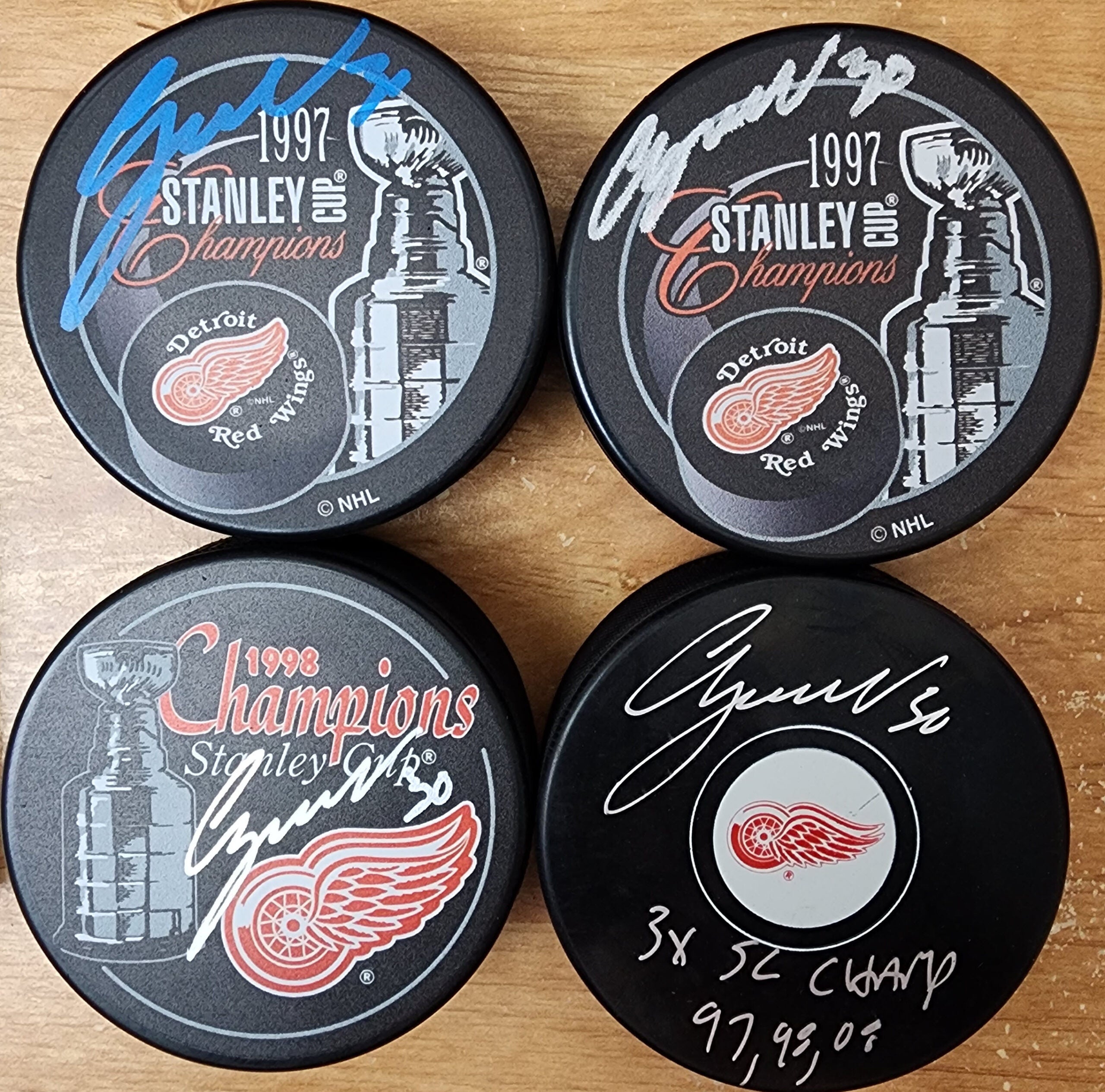You are purchasing this Chris Osgood Autographed Detroit Red Wings Puck Inscribed 3x Stanley Cup Champ JSA COA.