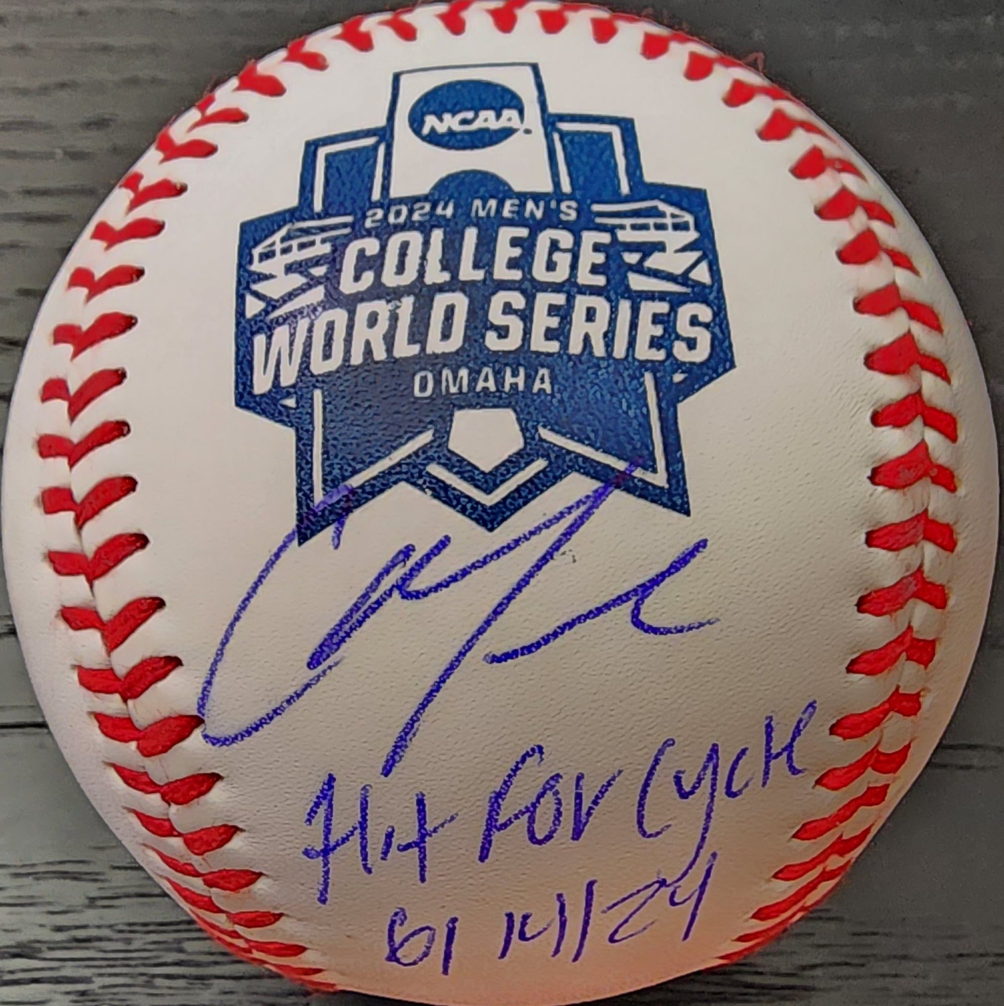 Christian Moore Autographed 2024 College World Series Baseball Hit For Cycle with Beckett Witnessed Certificate Of Authenticity