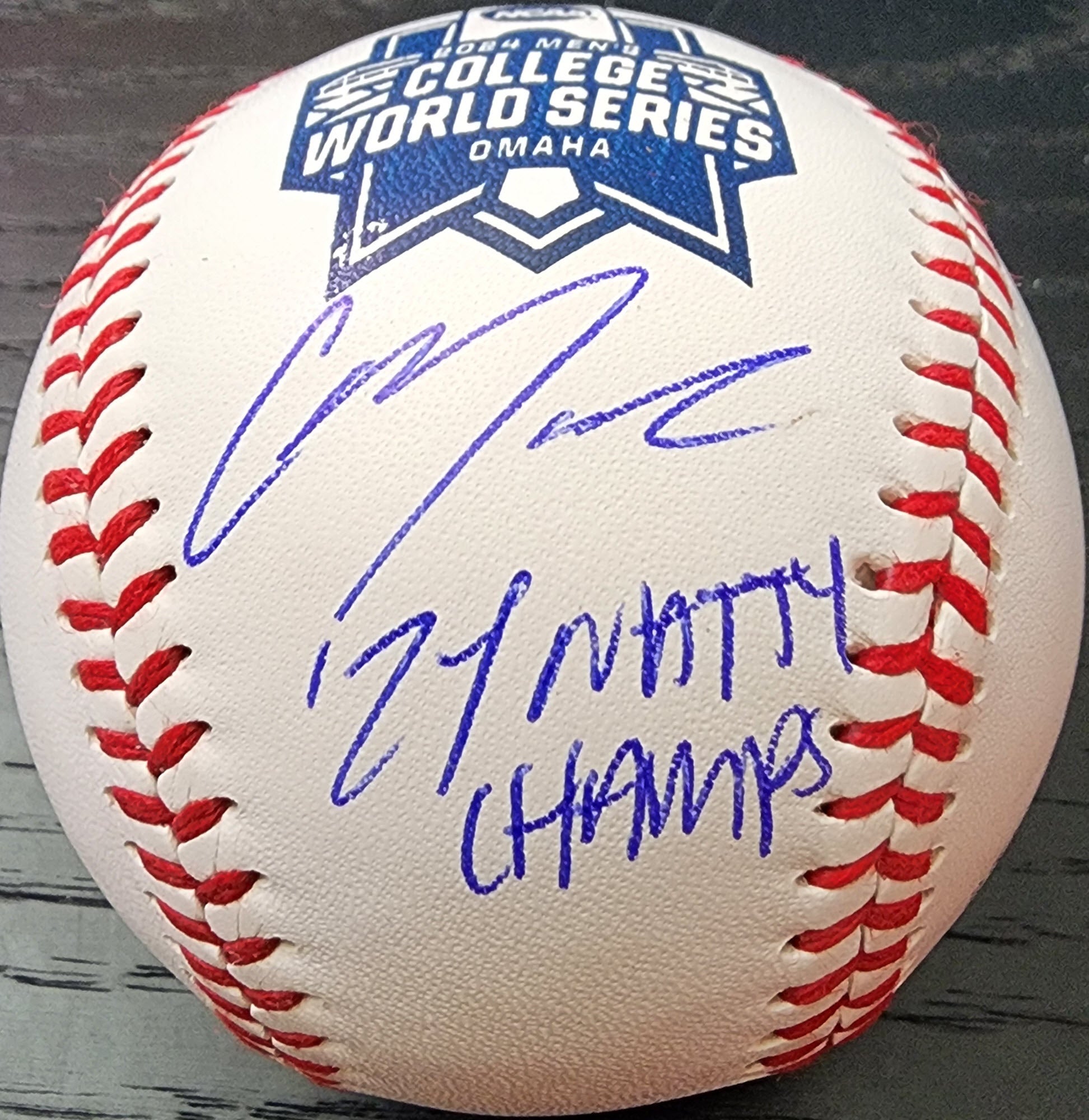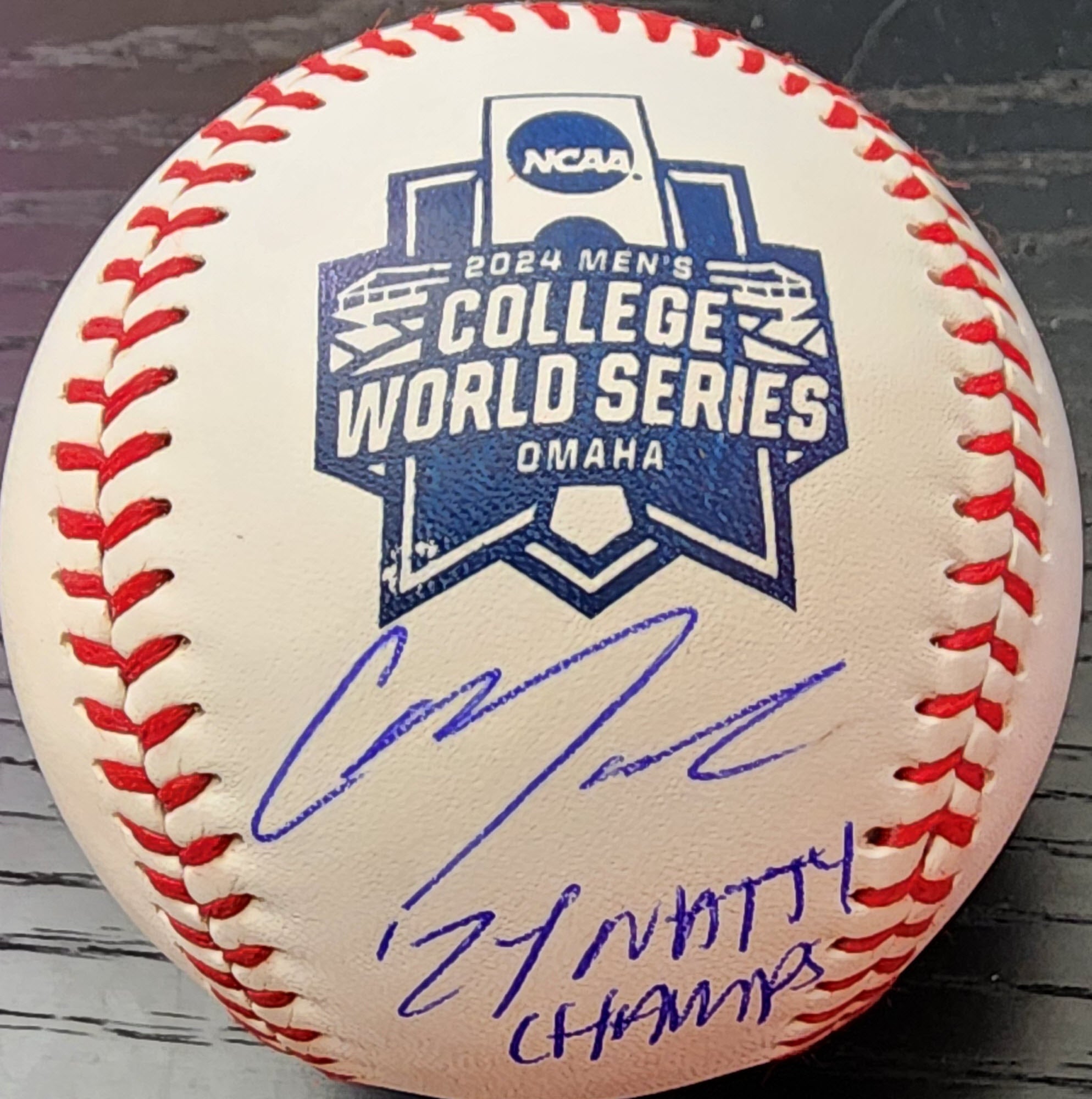Christian Moore Autographed 2024 College World Series Baseball Inscribed 2024 Natty Champs with Beckett Witnessed Certificate Of Authenticity