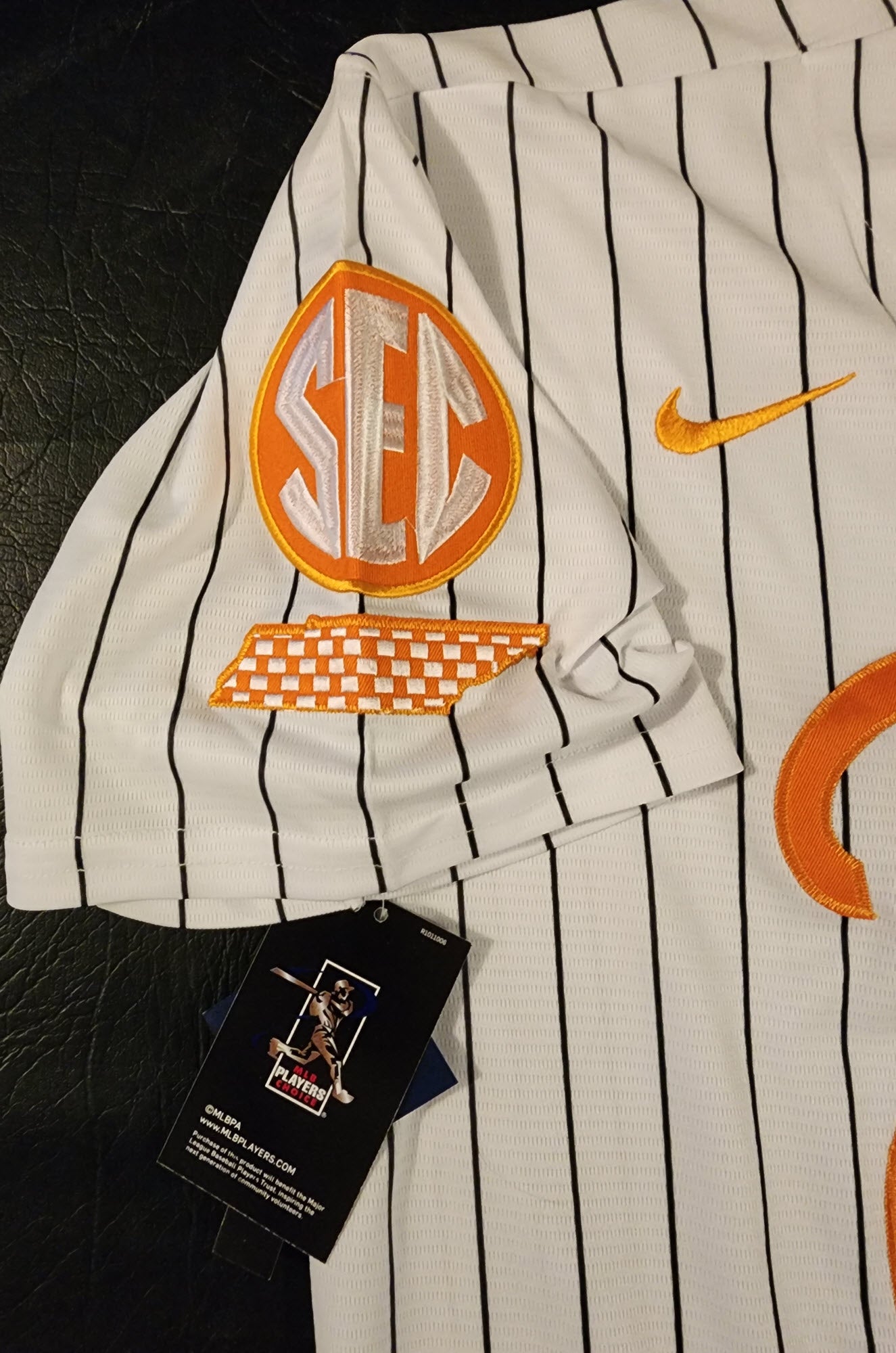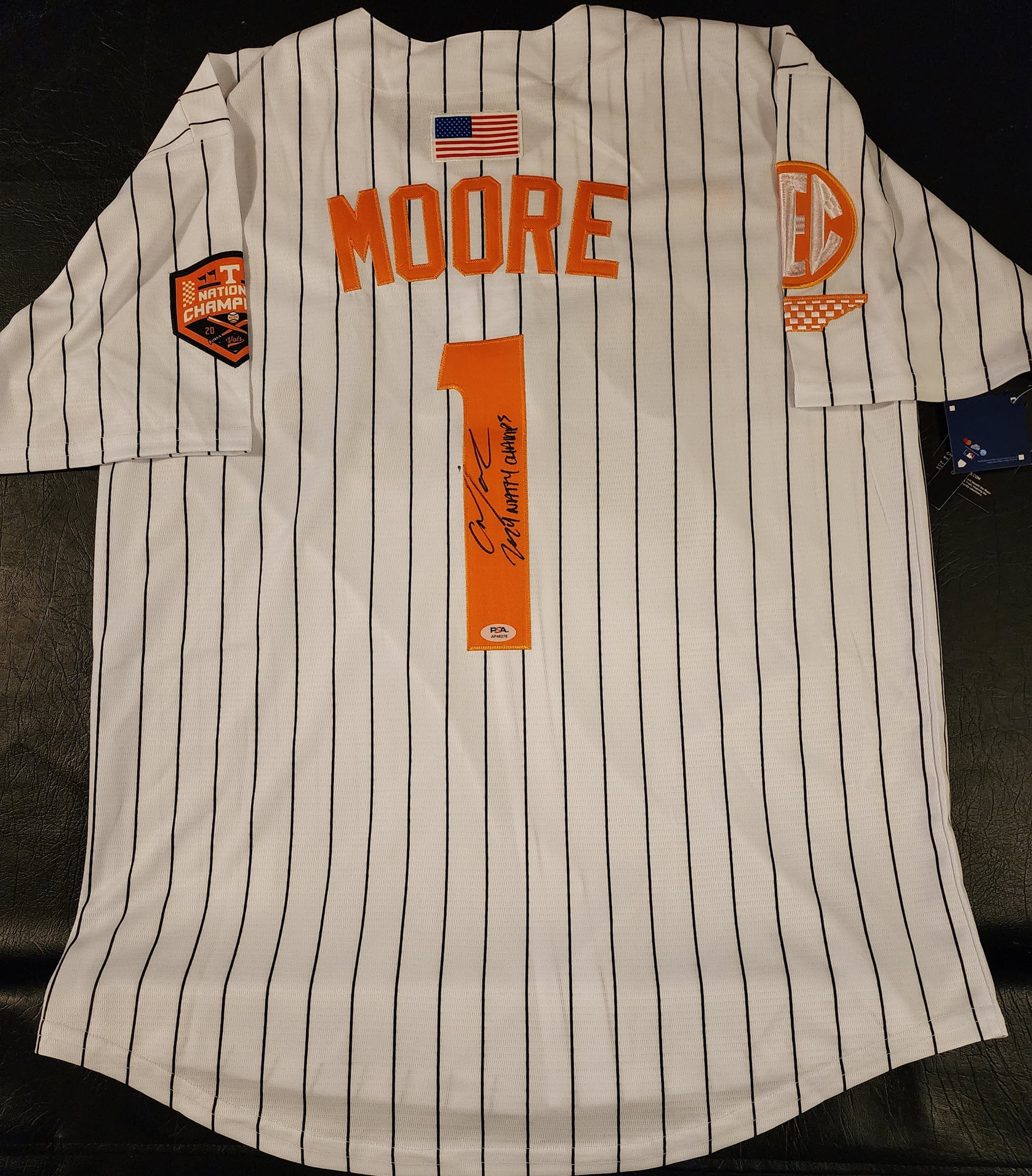 Christian Moore Autographed Pinstriped Tennessee Volunteers 2024 Mens College World Series Jersey Inscribed 2024 Natty Champs with PSA Certificate Of Authenticity