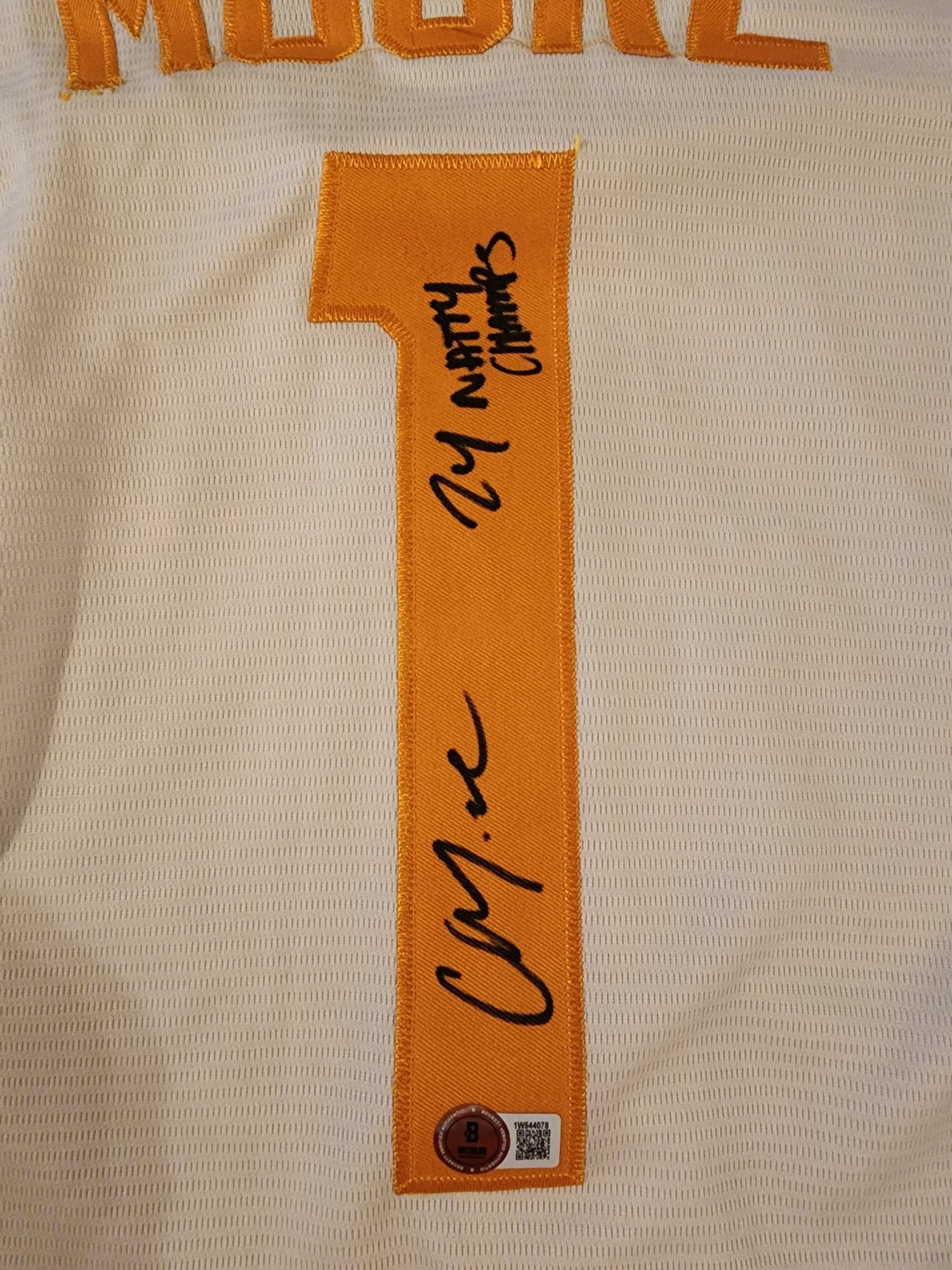 Christian Moore Autographed Replica Cream TN Volunteers Jersey Inscribed 24 Natty Champs with Beckett Witnessed Certificate Of Authenticity