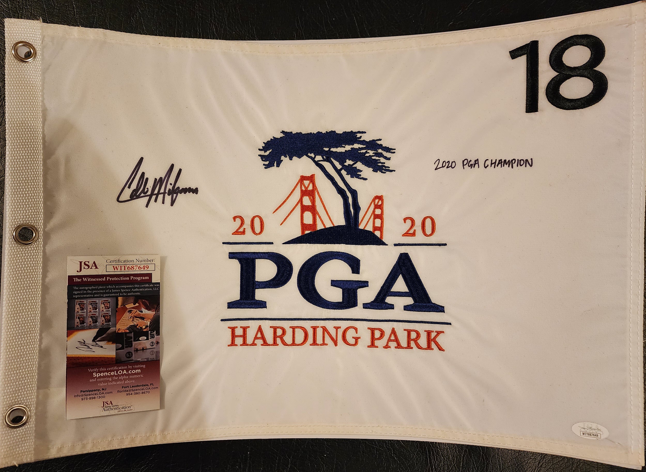 Collin Morikawa 2020 PGA Championship Embroidered Pin Flag Autographed and Inscribed JSA Witnessed