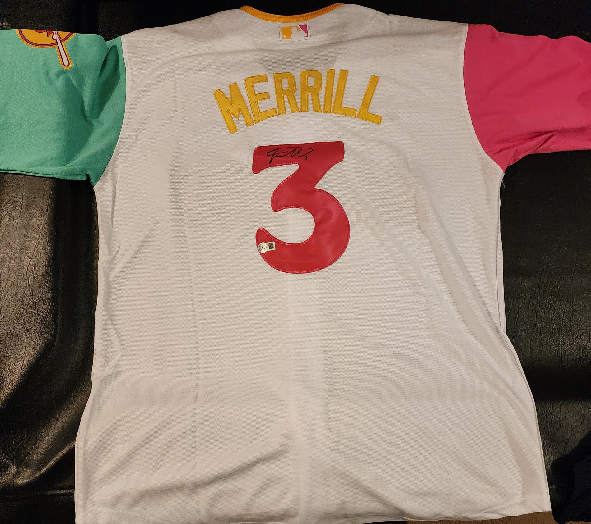 Jackson Merrill Autographed Padres White City Connect Jersey with Beckett Witnessed Certificate of Authenticity.