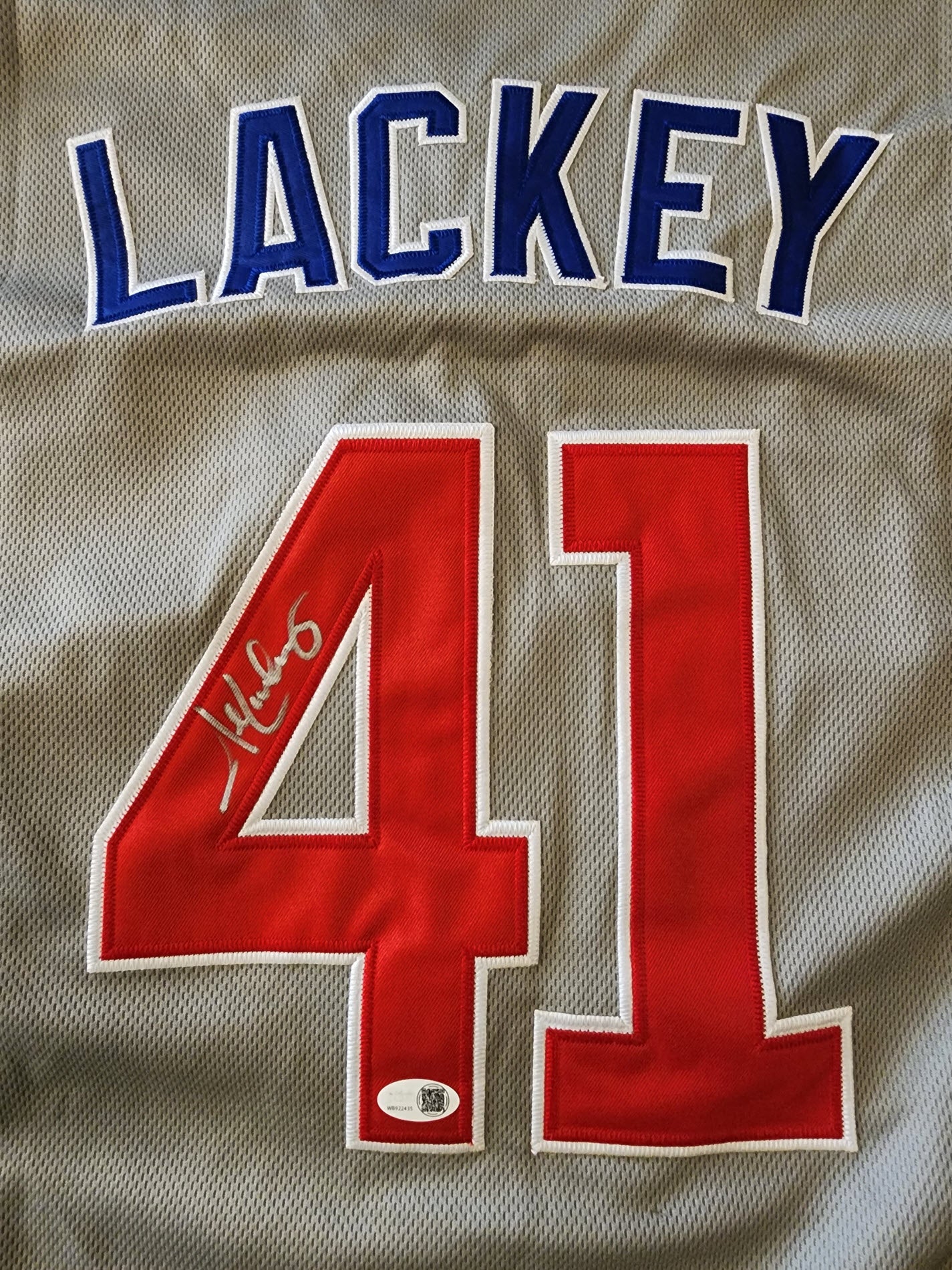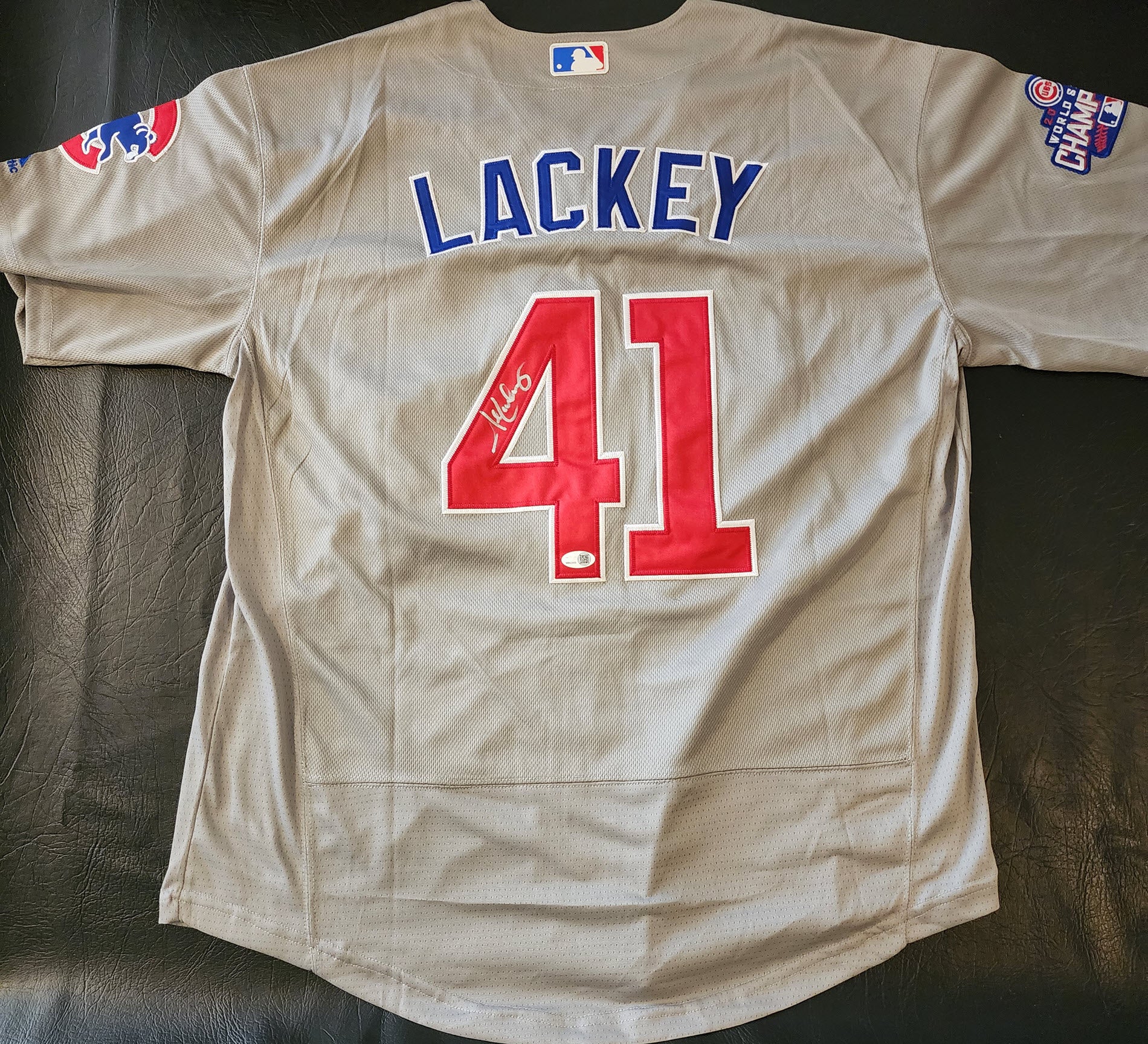 John Lackey Autographed 2016 World Series Chicago Cubs Road Jersey with JSA Witnessed Certificate Of Authenticity