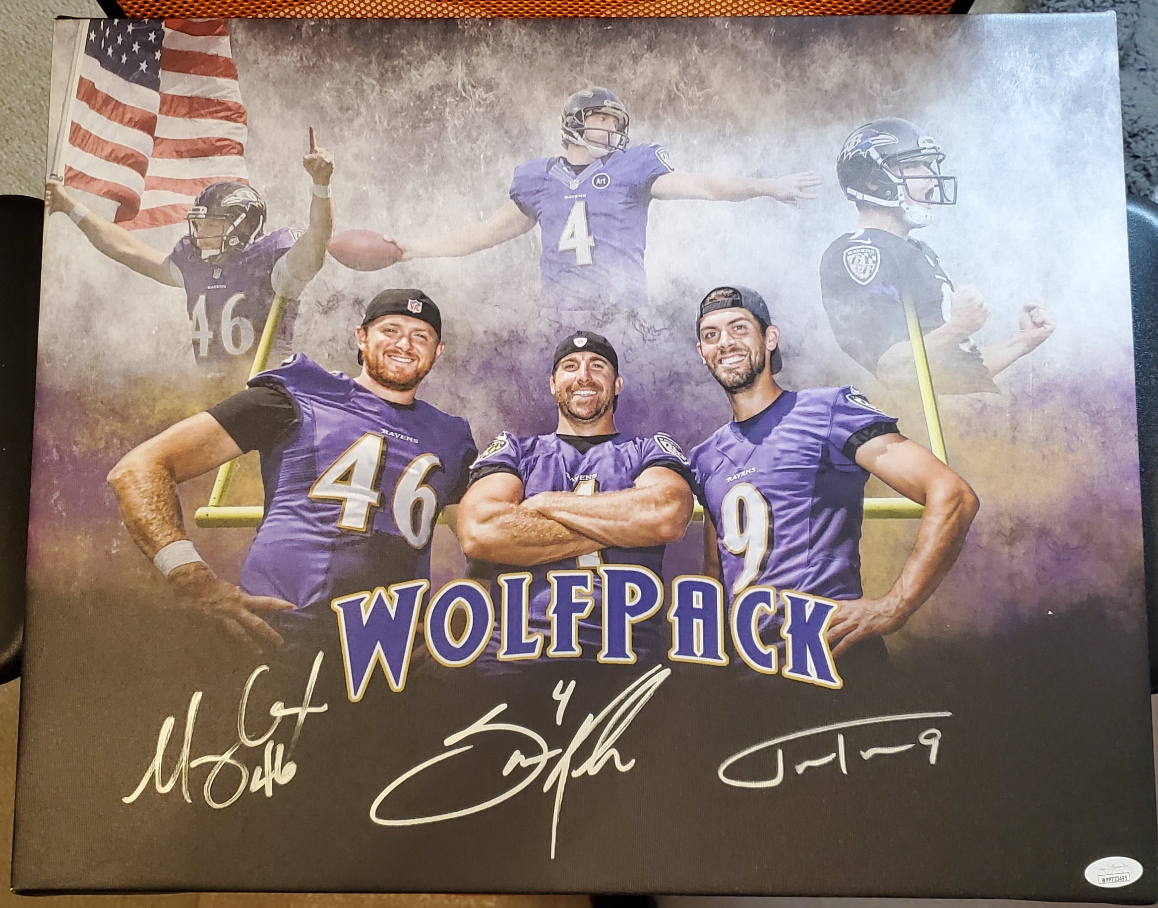 You are buying a Justin Tucker Wolf Pack Signed Canvas JSA Witnessed from the LGC Sports Marketing meet/greet we attended.