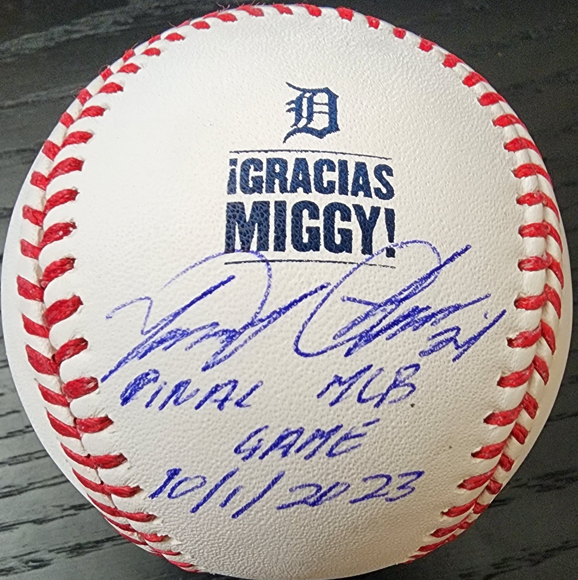 Miguel Cabrera Autographed Gracias Miggy Inscribed Final MLB Game 1012023 Baseball with a Beckett Witnessed Certificate of Authenticity