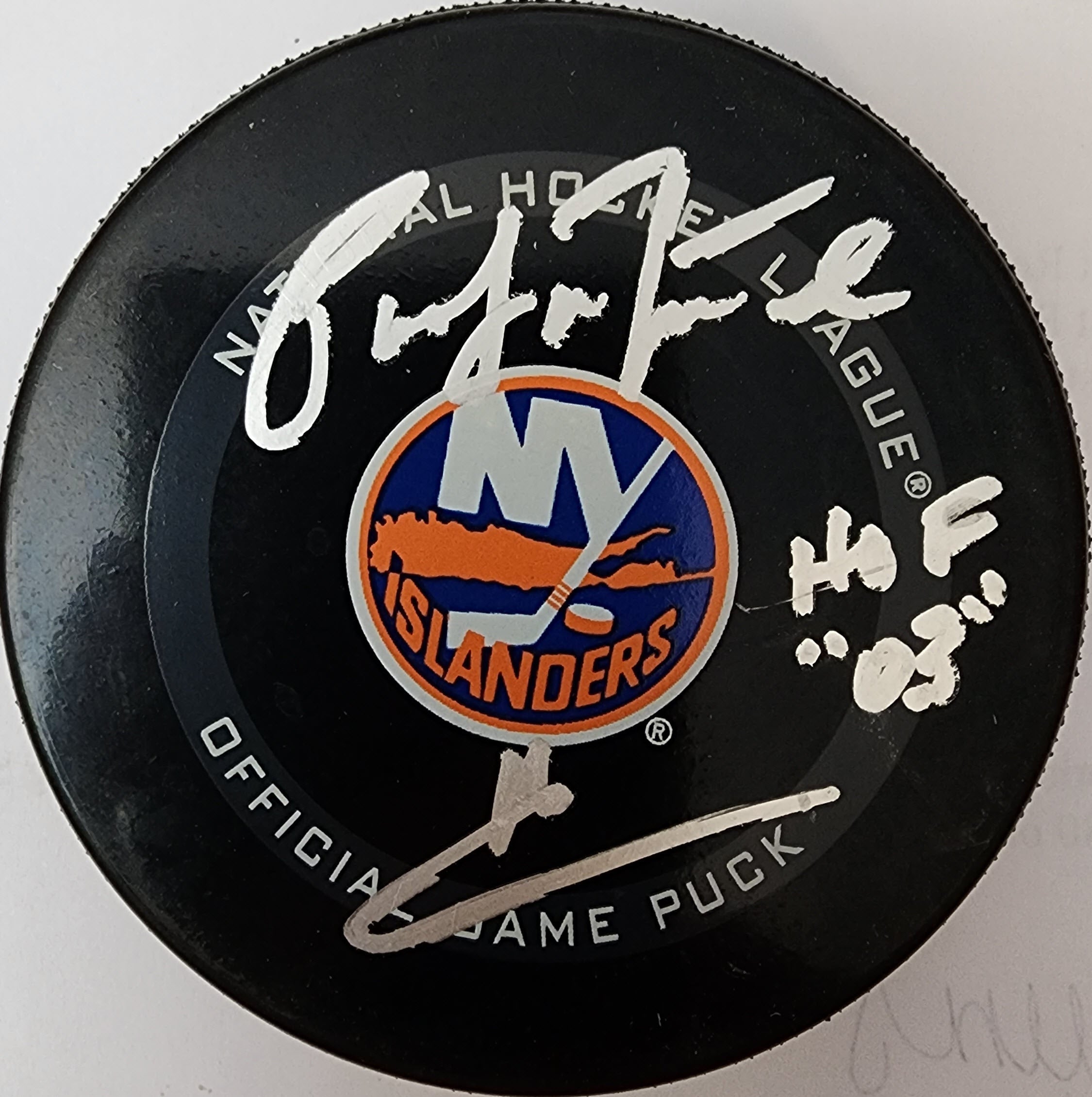 You are purchasing this Pat Lafontaine Autographed New York Islanders Official Game Puck with HOF 2003 Inscription JSA COA.