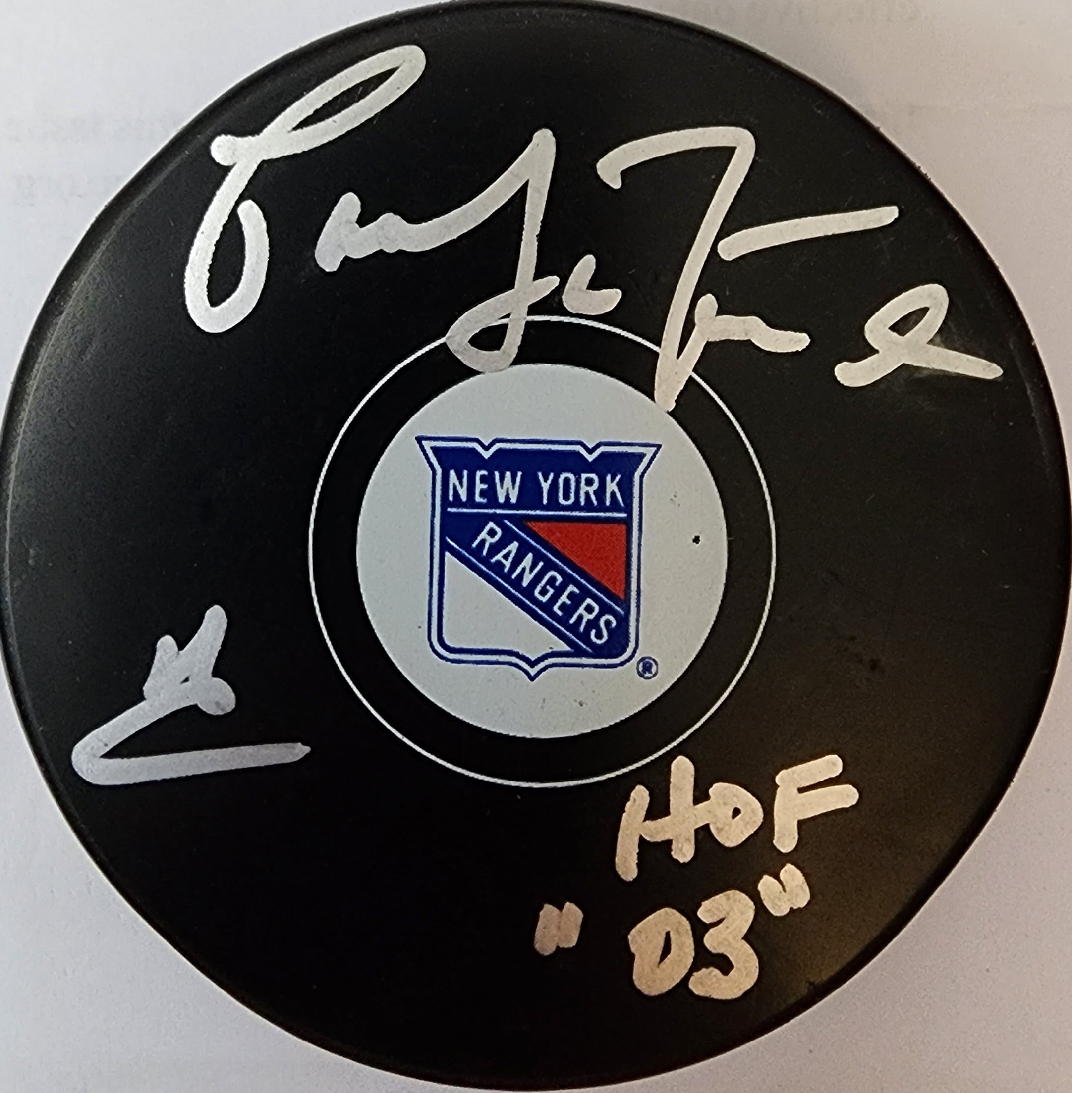 You are purchasing this Pat Lafontaine Autographed New York Rangers Puck with HOF 2003 Inscription JSA COA.