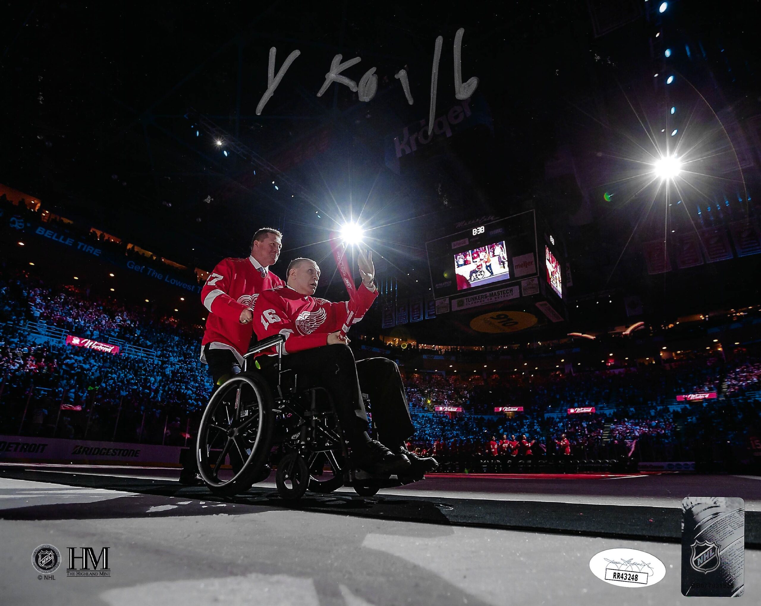 Proceeds go directly to The Vladimir Konstantinov Special Needs Trust that will be used for the ongoing care of Vladdie. Many of you know, he was involved in a horrific limousine crash just six days after the Red Wings 1997 Stanley Cup victory. As you can imagine that accident has changed his and his family’s life forever. Over the years, and with a lot of therapy, he has improved but there are still challenges. I have attached a picture of this photo autographed but understand we have several of these photos signed so the one you receive may not be exactly like the one you see here.